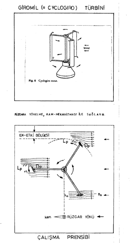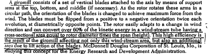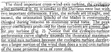 The third important cross-wind-axis turbine, the cyclogiro wind turbine (Fig. 6), is similiar to the Darrieus rotor but with two important differences. First, the airfoils are straight, and second, the orientation (pitch) of the blades is continuously changed during rotation to maximize wind force. The peak power coeeficients predicted for those turbines are greater than for any turbine (Fig. 2) Notice that the cyclogiro-turbine performance curve slightly exceeds the theoretical maximum for wind-axis turbines because the cyclogiro turbine decelerates a larger portion of the wind than does a wind-axis turbine of the same projected area of rotor disk. |