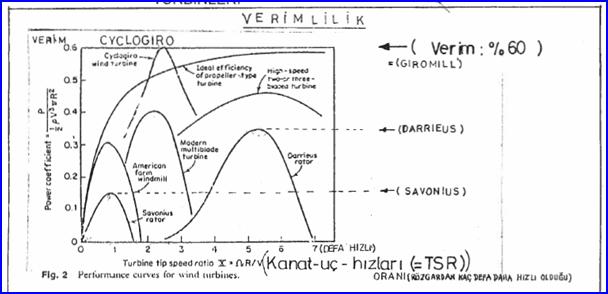 Please note that, cyclogiro-turbine performance curve slightly exceeds the theoretical maximum for wind-axis turbines because the cyclogiro turbine decelerates a larger portion of the wind than does a wind-axis turbine of the same projected area of rotor disk.